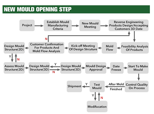 Producing Process | Audit drawings - mold flow analysis - design validation - Custom Materials - mold processing - core processing - electrode machining - Runner system processing - parts processing and procurement - machining acceptance - cavity surface treatment process - complex mode Die - The entire mold surface coating - Mounting plate - mold sample - sample test - sending |
